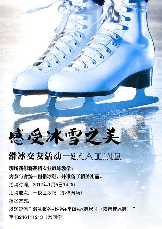 报名方式:发送短信“滑冰报名+姓名+年级+冰鞋尺寸(或自带冰鞋)”至18246111213(常同学)。