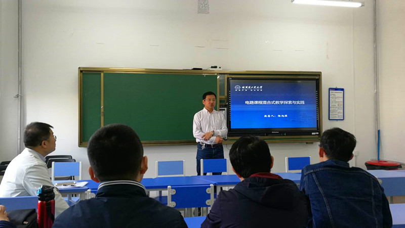 霍炬首先介绍了《中文字幕av 一流本科教育提升行动计划2025》(征求意见稿),对学院下一步教学工作提出了新要求。随后,于艳君老师以“如何实现以学生为中心的教与学”为主题做了专题发言,分享在明尼苏达大学培训的收获及体会,主要探讨课堂即时测试方法、互动式教学等方面的内容与体会。杨旭强老师以“电路课程混合式教学探索与实践”为主题做了专题发言,讲述了我校研讨型教室现状及使用方法和基于雨课堂的电路混合式教学探索与实践